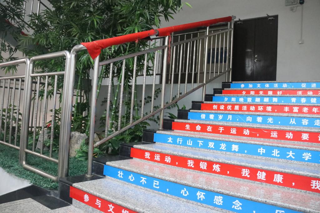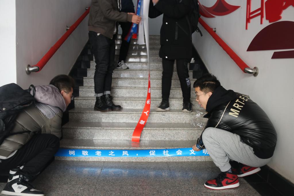 党建办公室和青志部联合开展,经过前期征集标语,筛选标语,广泛宣传动员等环节,活动正式开始。首先离退休人员管理处韩文剑老师做动员讲话,随后志愿者们开始工作,大家分工明确,各司其职,将标语整齐美观的张贴在67层台阶上。标语体现了离退休处“尊老爱老敬老”,“老有所养,老有所乐”以及“发挥预热,增添正能量”的工作、服务理念。