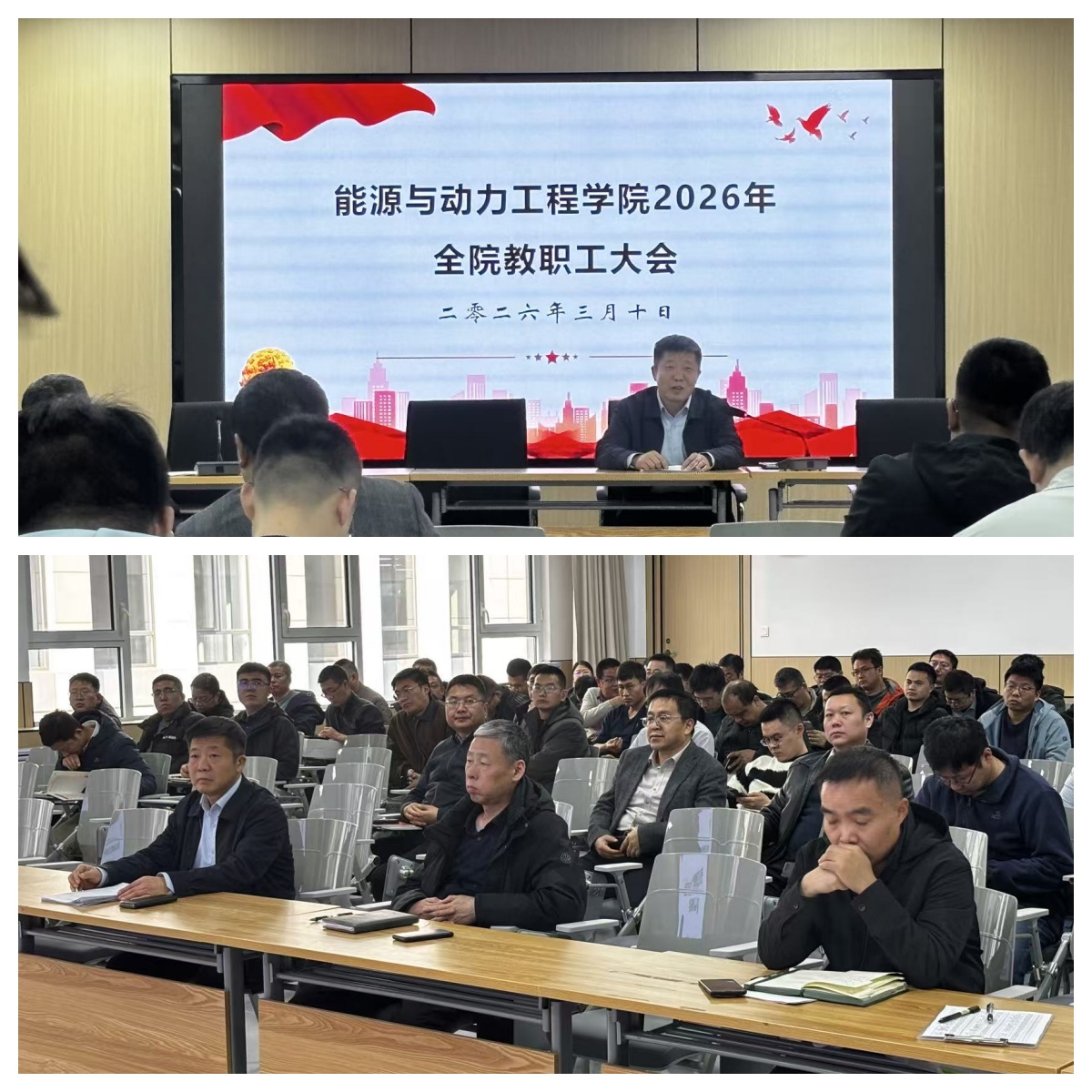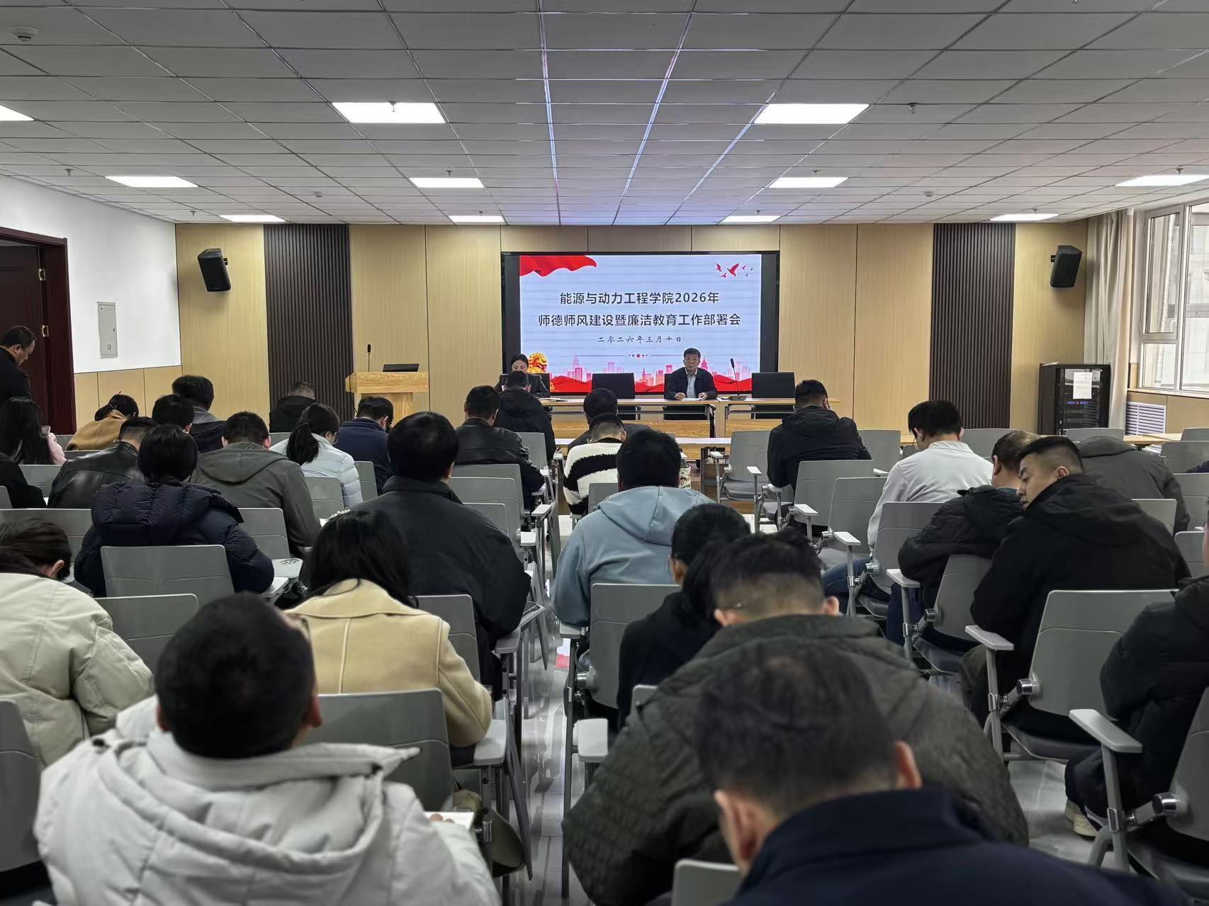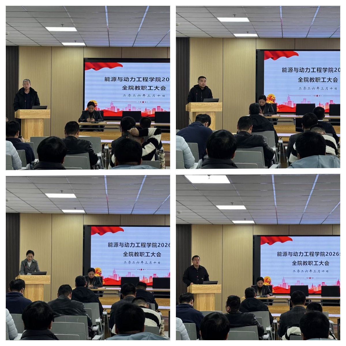 在能源大楼A202卓越学术报告厅隆重召开春季学期全院教职工大会,全体教职工参会,会议由院党委副书记兼副院长任雁主持。