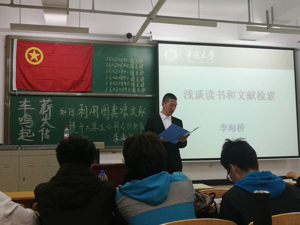 大二的六个班来了一次大集会,大二的老腊肉们坐满了15106教室。这正是本次的联合团日活动《车鸣起 薪火传——如何利用图书馆文献资料提高大学生的科技创新能力》讲座现场!
