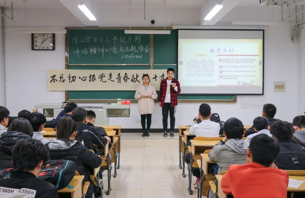 大会开始,班长组织全班同学观看了习近平总书记系列讲话视频。之后,李运芝书记进行了主题讲话,李老师将自身经历与理论结合,深入贯彻党的十九大精神,为我们梳理了有关两会的基本知识,讲述了新中国成立以来到实行改革开放,中国一步一步走向富强、走向民主、经济不断发展、基础设施不断进步完善的光辉历程。他强调,青年要牢记自身的使命,脚踏实地在党的带领下继续前进,同学们深有感触。团支书做活动总结后,本次活动圆满结束。