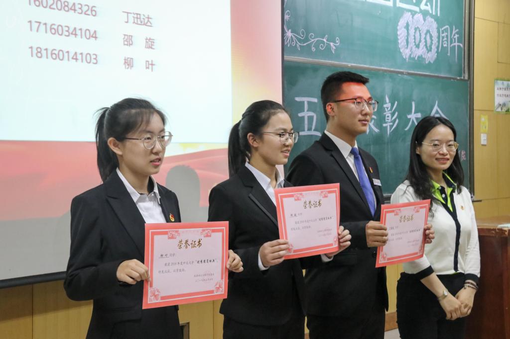 于5月10日在11109教室举办了纪念五四运动100周年暨建团97周年表彰大会。出席本次活动的嘉宾有校团委副书记魏翀、院党委书记李运芝、院学生科科长叶增民、院团委书记李晓彧、学生科辅导员乔洋以及研究生辅导员杨勇、唐金保。院团委学生会部长级以上学生干部、所有团委学生会后备、获奖集体及个人、17与18级各团支部代表也参与了此次大会。