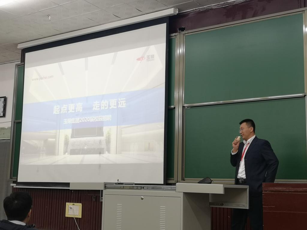 开始,招聘人员和我们一同观看了玉柴集团2020年的宣传片,给我们对玉柴进行了一个简单的初步介绍。之后,HR针对玉柴集团集团介绍、个人发展、公司环境、招聘需求四个方面展开讲述。通过此次宣讲,同学们了解到玉柴集团所处地理位置、历史发展、所获荣誉、工资待遇、集团制造产品以及所持有的专利等多方面的内容。