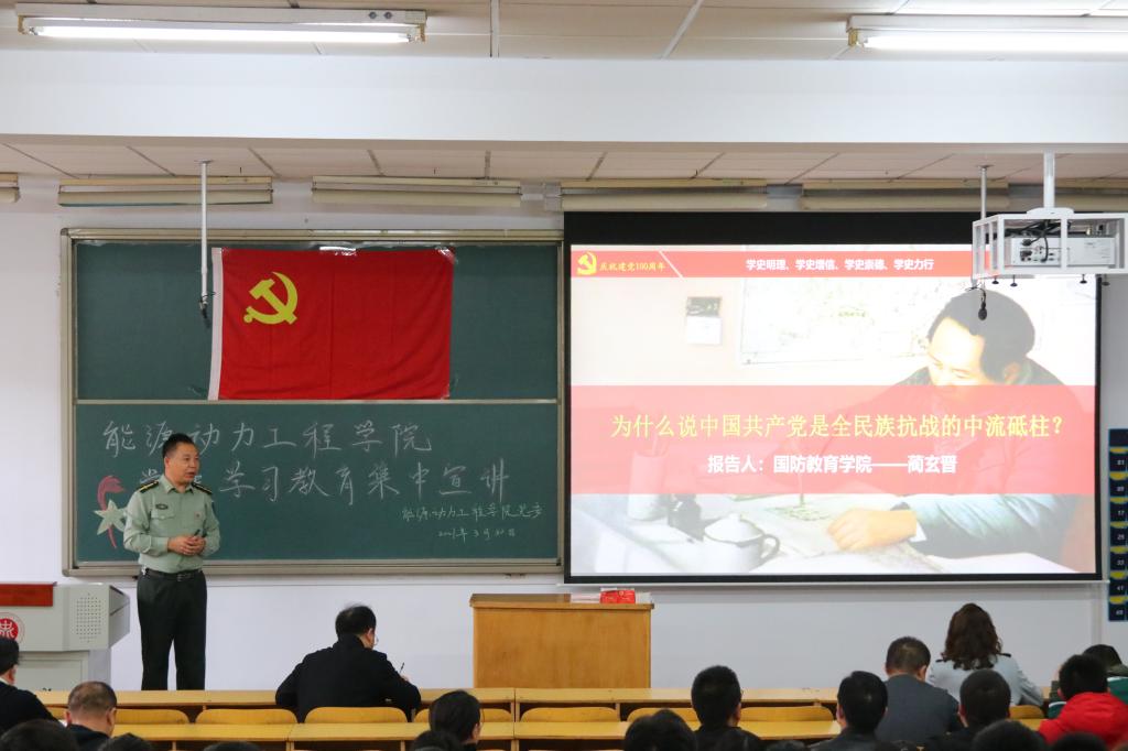 2021年3月30日下午,能源动力工程学院在08201H举行党史学习教育第一轮集中宣讲活动,本次宣讲邀请到校宣讲团成员国防教育学院蔺玄晋老师担任主讲嘉宾。本次宣讲活动由院党委副书记任雁主持,学院全体师生党员参加。