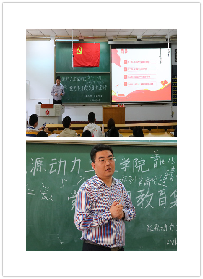 为持续推动党史学习教育效果,2021年4月20日下午能源动力工程学院在08101H举行党史学习教育第二次集中宣讲活动,本次宣讲邀请到校宣讲团成员马克思主义学院副院长杜刚担任主讲嘉宾,院党委副书记任雁主持,学院全体师生党员参加了学习。
