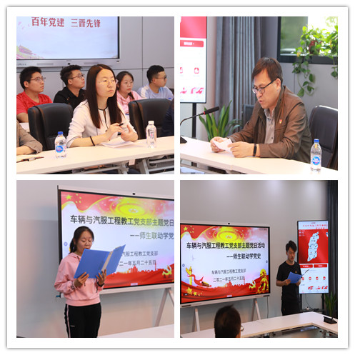 首先,车辆与汽服工程教工党支部书记韩文艳介绍了本次主题党日活动的内容和意义。随后,教工党员代表韩文艳、毛虎平和学生党员代表王瑾、张步伟四位同志对党史学习心得进行了分享。通过党史学习,大家深切感受到,正是一代又一代中国共产党人顽强拼搏、不懈奋斗,我们才能有今天的幸福美好生活。作为新时代的教师,我们要做好大先生,促进学生成长为全面发展的人;作为新时代的青年,我们要勇敢肩负起时代赋予的重任,争做新时代的青年先锋。