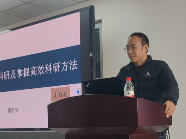 吴栋创博士以《如何快速融入科研及高效科研方法》为主题,聚焦研一阶段科研适应与能力提升展开分享。他首先就新生如何快速融入科研节奏、适应团队环境提出了切实建议,涵盖心态调整、文献阅读、与导师有效沟通等方面,帮助同学们为后续科研工作打下坚实基础。接着,吴博士系统介绍了高效掌握科研方法的路径,从实验设计、数据处理到成果凝练等关键环节逐一解析,引导同学们理解高质量科研成果的产生逻辑。