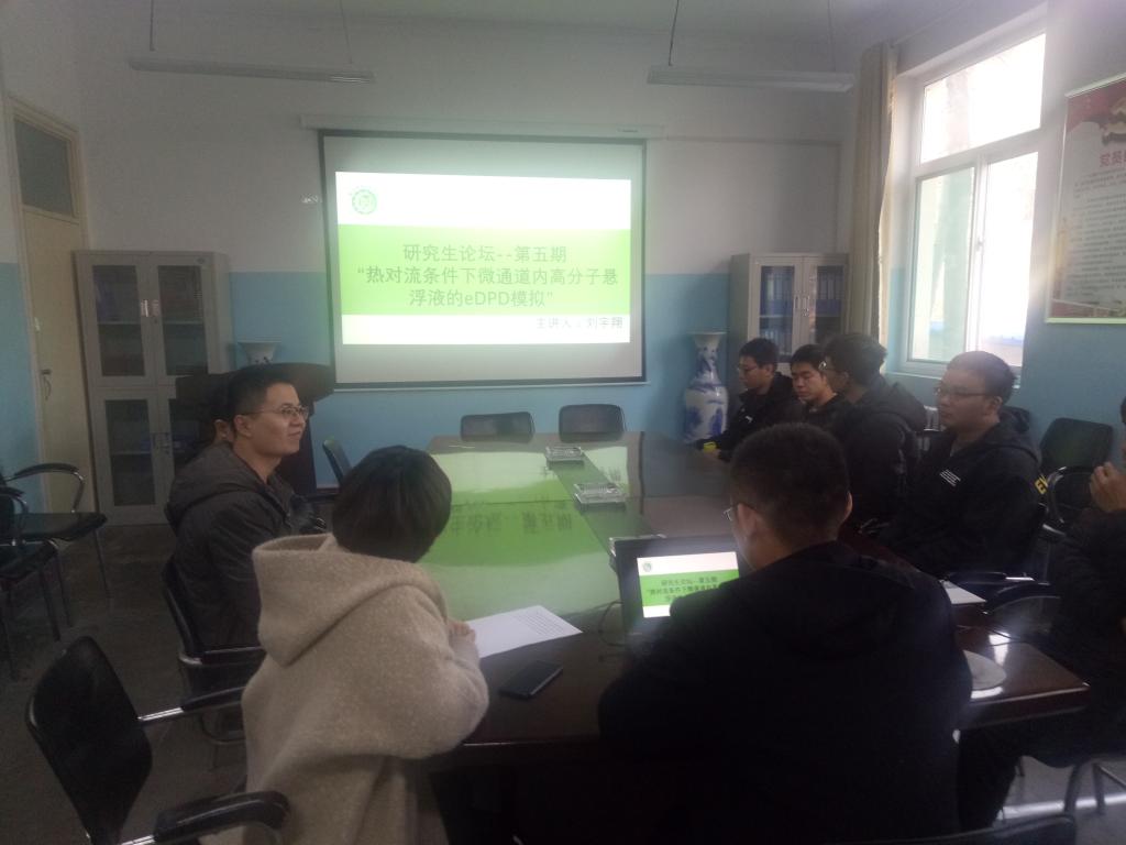 2018年11月23日 下午14:30,能源动力工程大发彩票 研究生论坛在诚学楼会议室成功举办。本次论坛的主讲人是大发彩票机械工程在读研究生刘宇翔,主题是能量守恒耗散粒子动力学(eDPD)的相关概念及理论和微通道内高分子悬浮液模拟结果与讨论。论坛由辅导员祁亚萍老师主持,大发彩票部分研究生参加了本次论坛。